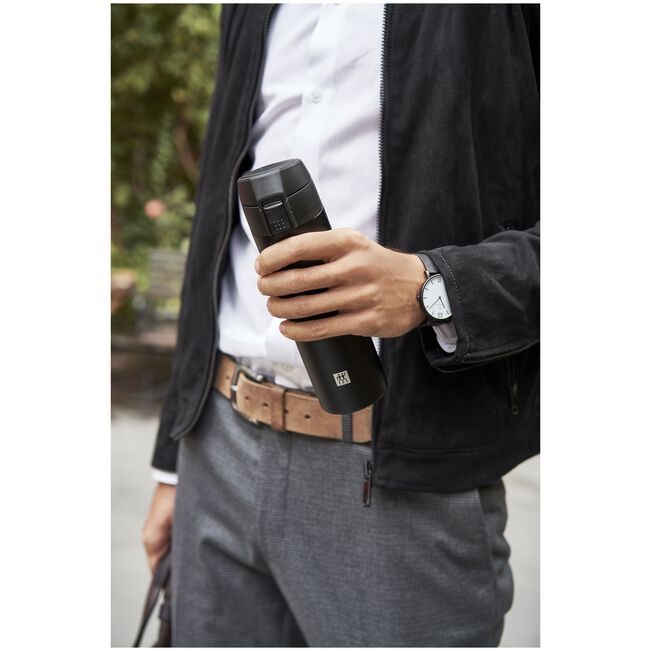 With milk and sugar? Or preferably black? However you like your coffee, the ZWILLING Thermo Travel Mug in black lets you take it everywhere with you. The Thermo mug with vacuum insulation keeps drinks like coffee and tea hot for up to 7 hours and cool refreshments cold for up to 12 hours. The travel mug holds up to 450 ml and is dishwasher-safe. The insulated travel mug also offers a safety cap that's leakproof and which prevents the contents from accidentally ending up in your bag. The cap opens easily using just one hand. And it can even be taken apart for quick cleaning when needed. The coffee-to-go mug is made from high-quality stainless steel and features a practical non-slip base. It doesn't accidentally slip when filling it and placing it on surfaces is soft and almost noiseless. The Thermo mug's design is minimalistic and underscores the premium quality. The matte black design is absolutely modern and simply looks good.